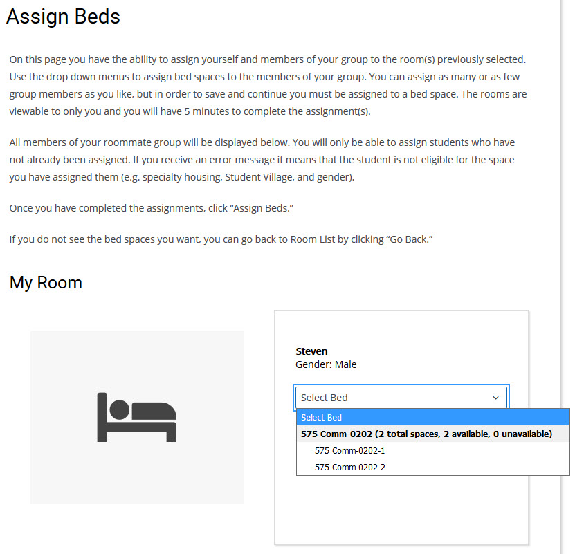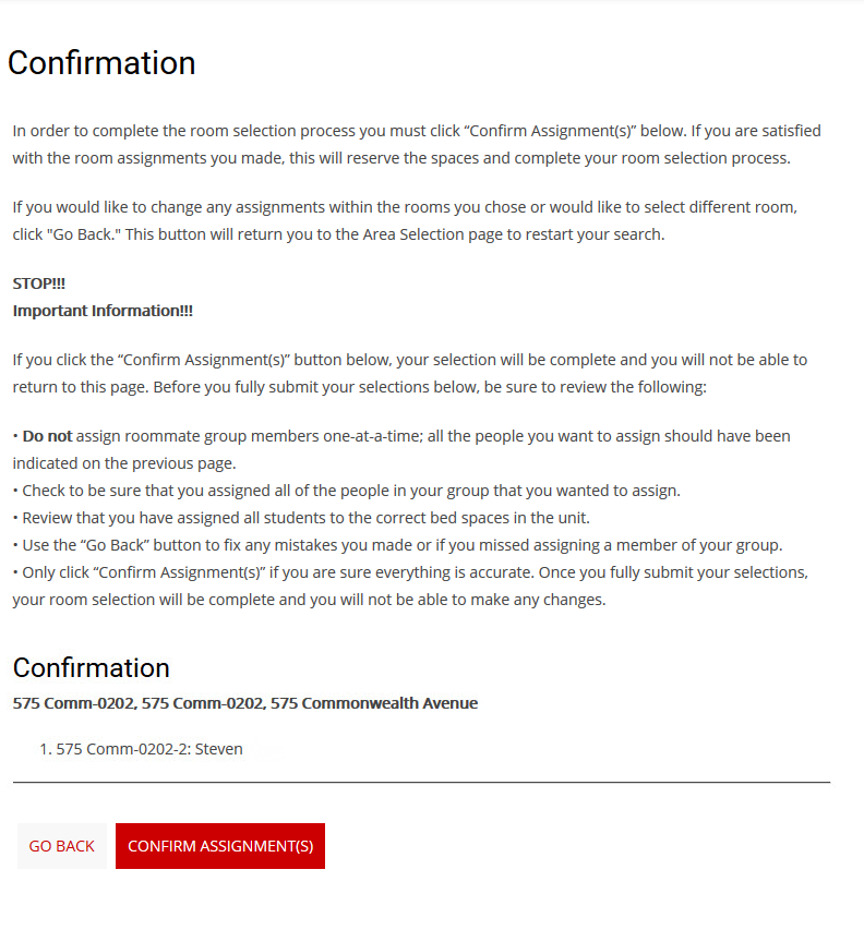 This is the final step of the room selection process. Here you will be able to view where you have assigned yourself and any group members.