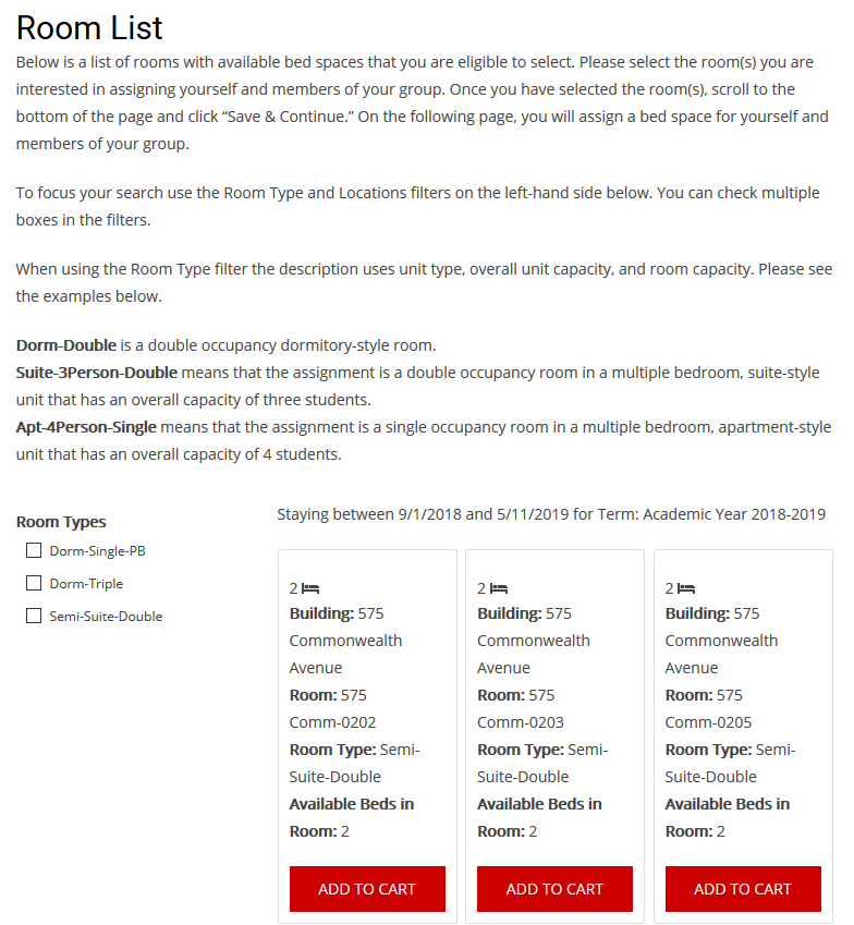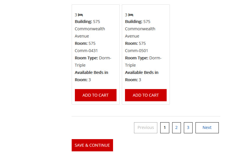 A list of available rooms that you are eligible for will be displayed. Select the room(s) that you will be assigning to yourself and any potential roommates from your group. Scroll to the bottom on the page and click “Save & Continue.”