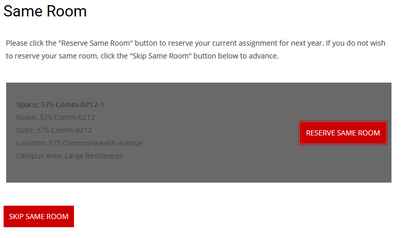 In order to reserve your same room, you will be prompted with information about your current room assignment. This includes the campus area, location, room, and space. If you intend to stay in your room for the up-coming year please confirm your room by clicking “Reserve Same Room.” Once the room has been reserved you will advance in the application where you will confirm your selection. If you do not wish to remain in your current room, then click “Skip Same Room.” You will receive information at a later time to continue with the Room Selection process.