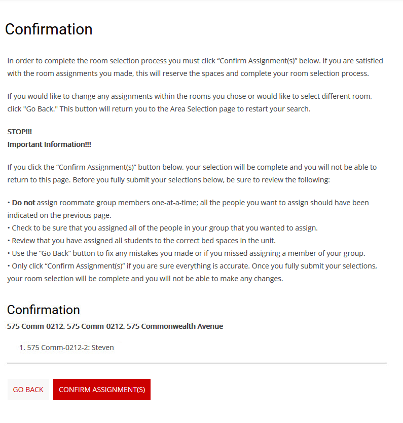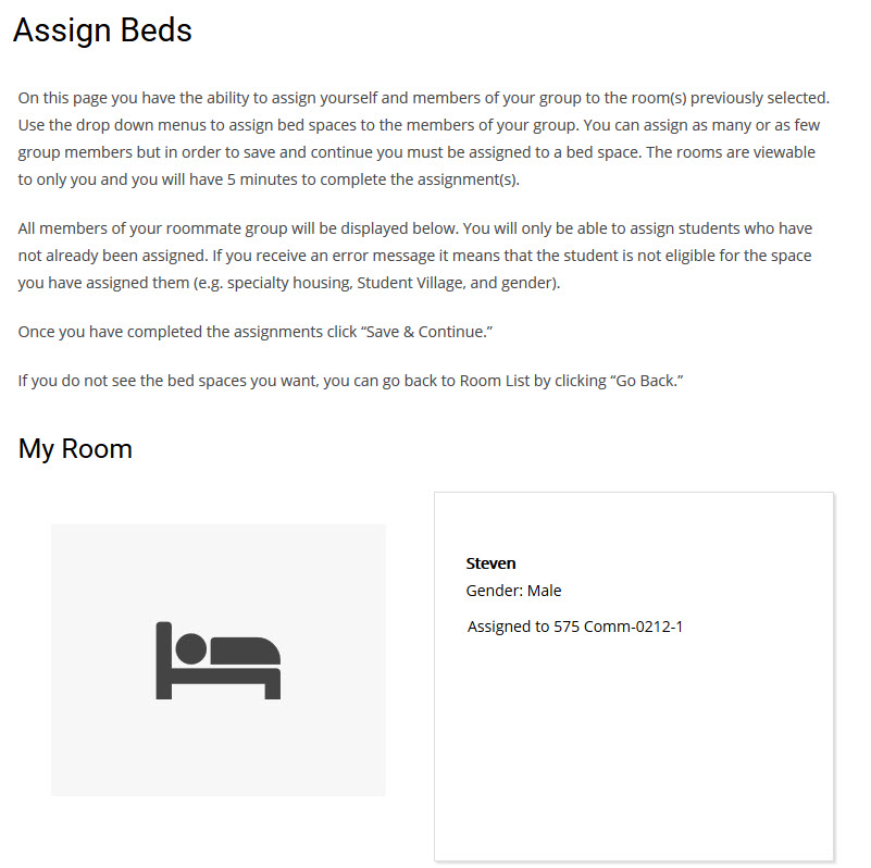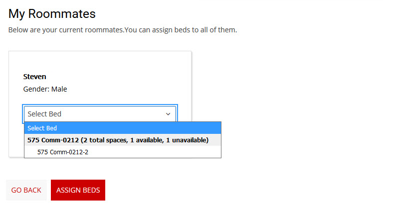 If at any time you wish to go back, click the “Go Back” button at the bottom of the page. Once you are done assigning spaces, click “Assign Beds.”