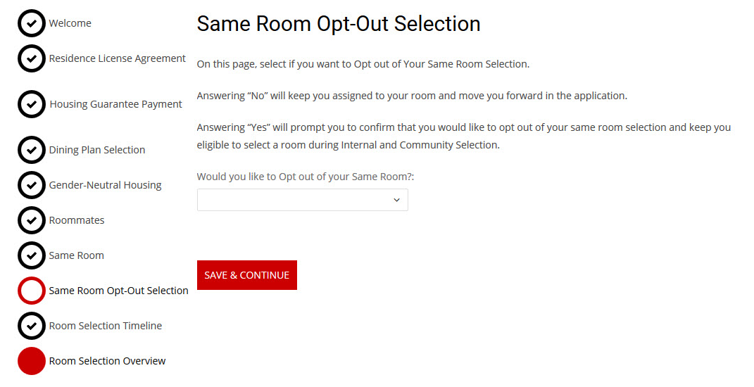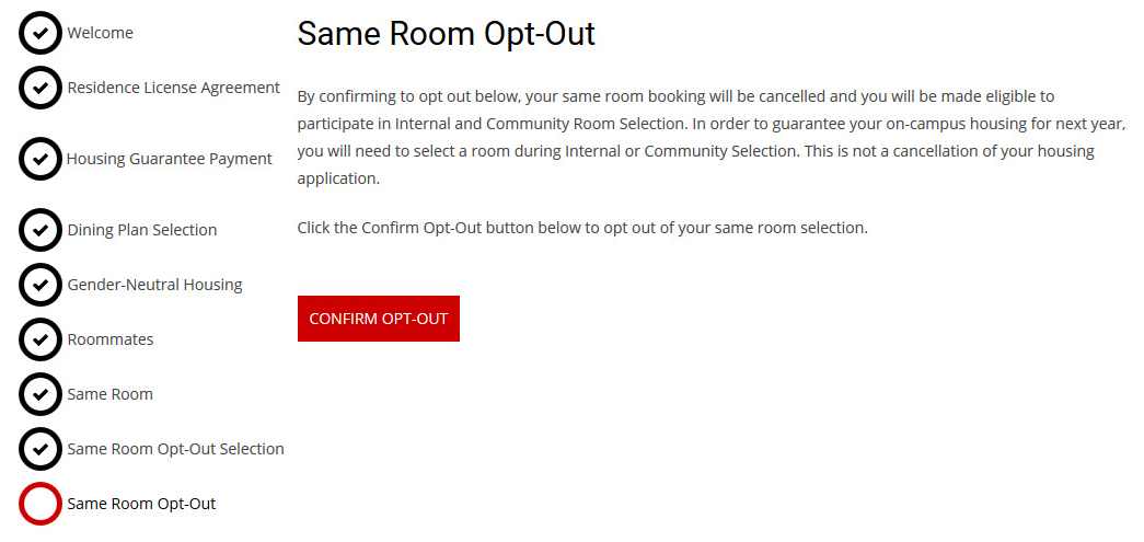 At any time during the Same Room Selection process, if the student does not wish to remain in their same room, they may opt out of this selection. This needs to be completed by the end of the Same Room Pull-In Process. However, you cannot opt out of your same room if you have pulled other students into your room. Once opted out, the student will remain eligible in the room selection process and participate in Internal and Community Room Selection. Opting out of your same room is not a cancellation of your application.