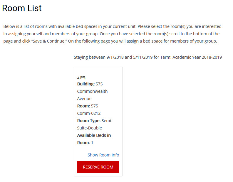 In order to perform a pull-in into your same room, you will start on the Room List page where you will see a list of the bedroom(s) with available beds in the unit. In units with multiple bedrooms, select all bedrooms that you intend to fill by clicking “Reserve Room” and then click “Save & Continue” at the bottom of the page.