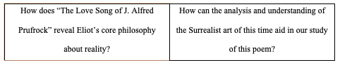 2. In order to cement this concept in their minds, have the students pick out spots in the poem which they find to be particularly surreal and explain what these moments reveal about Prufrock’s view of them.