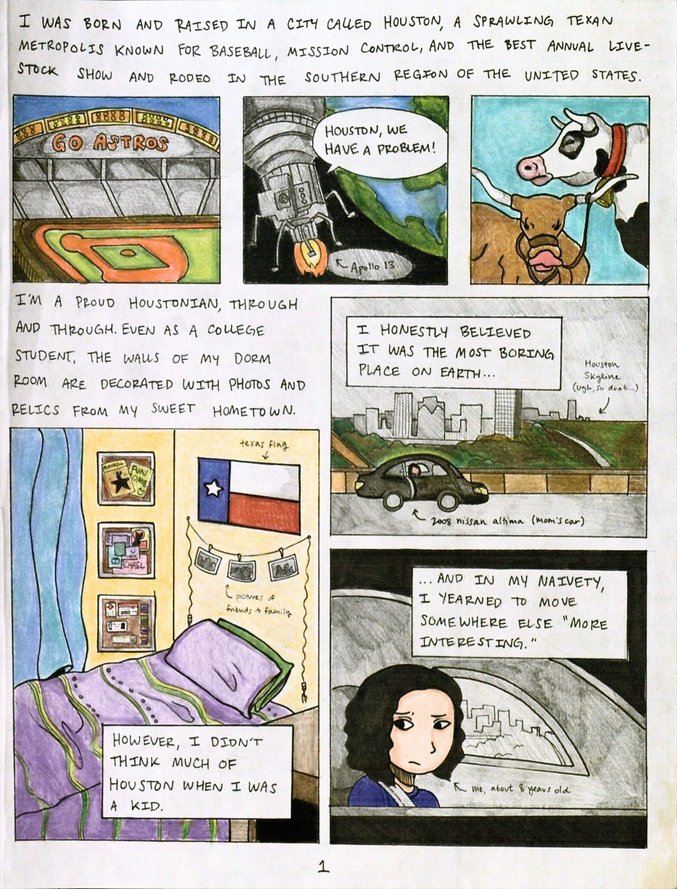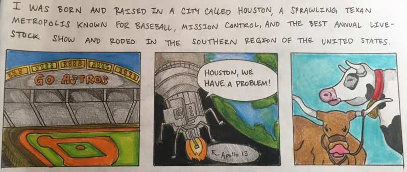 Since Hello, Hometown focuses primarily on my character Rachael’s relationship with the city of Houston, I wanted to make sure I painted a thorough picture of it within the mind of the reader from the very beginning. In Understanding Comics, Scott McCloud describes the importance of aspect-to-aspect transitions when introducing a setting. “Aspect-to-aspect transitions,” he states, “bypass time for the most part, and set a wandering eye on different aspects of a place, idea, or mood” (72). With this in mind, I began Hello, Hometown by discussing and illustrating the various prominent features of Houston that I opened with in my original oral storytelling presentation (Fig. 1).