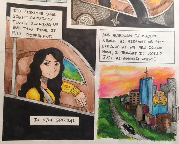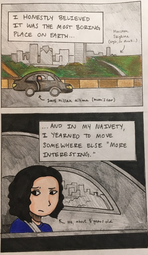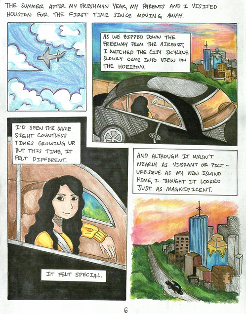 Of course, Hawaii’s tropical scenery isn’t visually mundane in the slightest. Certain aspects of island life—such as bad traffic and repetitious weather patterns—are instead what she perceives to be monotonous and mundane about Hawaii. In Hello, Hometown, Rachael realizes that it’s the opposite in Houston only after moving away: what Houston lacks in surface-level beauty, it makes up for in the understated vibrancy of its residents’ lifestyles. I visually depicted this perspective shift in the vastly different portrayals of the Houston skyline on pages one and six, despite the obvious car ride parallel (Fig. 4 and 5).