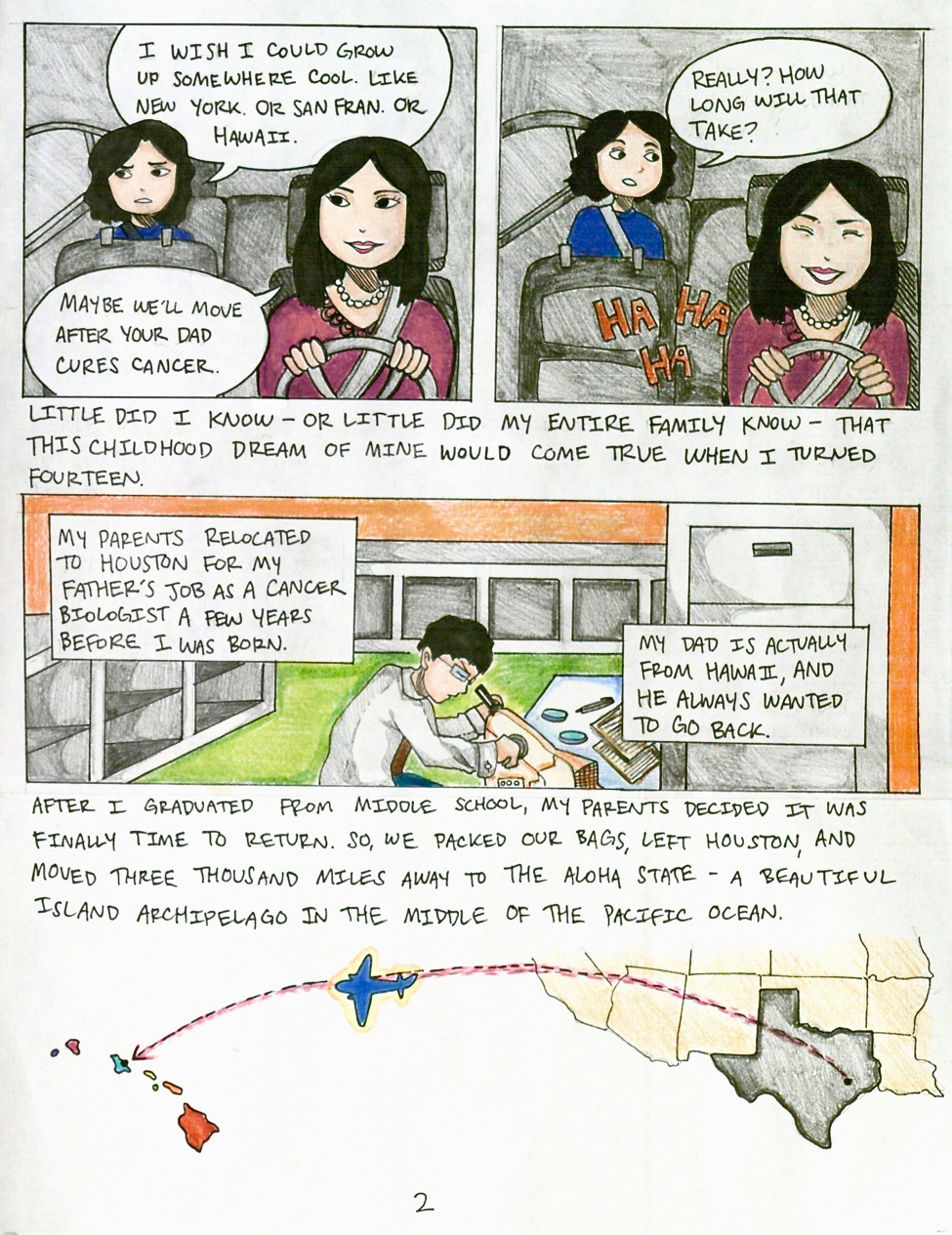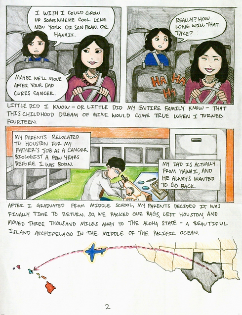 While graphic memoirs and oral storytelling narratives present vastly different mechanisms for creative self-expression, they still have many technical elements in common. For example, both graphic memoirs and oral storytelling narratives allow the storyteller to zone in on a specific event, time span, or relationship with a place, person, or object, and their feelings surrounding it. For instance, Alison Bechdel’s award-winning graphic memoir, Fun Home, focuses primarily on Bechdel’s complicated relationship with her father. Meanwhile, David Small delves into his struggles growing up with physical disability and emotional neglect in Stitches. My own graphic memoir, entitled Hello, Hometown, is based on an oral storytelling I performed previously, which examined my childhood perspective on my hometown of Houston, Texas, and how it changed when I moved to Hawaii as an adolescent. I utilize differences in artistic detail and color contrast coupled with expository text and dialogue throughout Hello, Hometown in order to visually convey the same shift in perspective I communicated in my oral account of the same story.