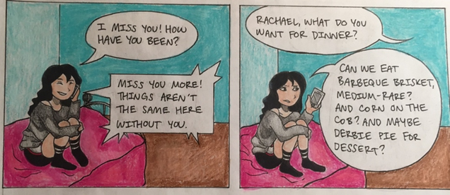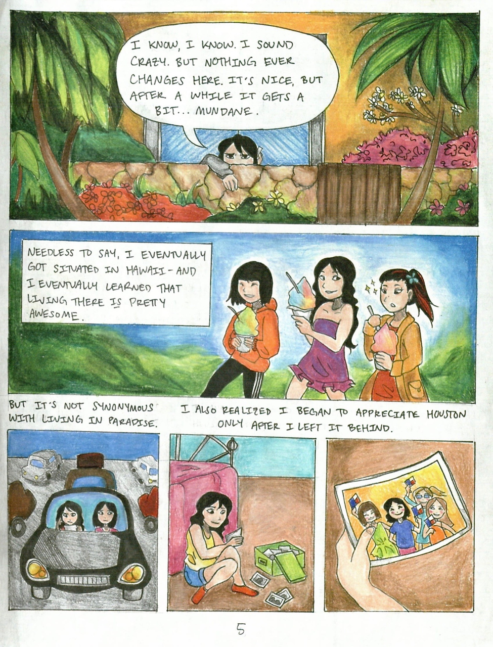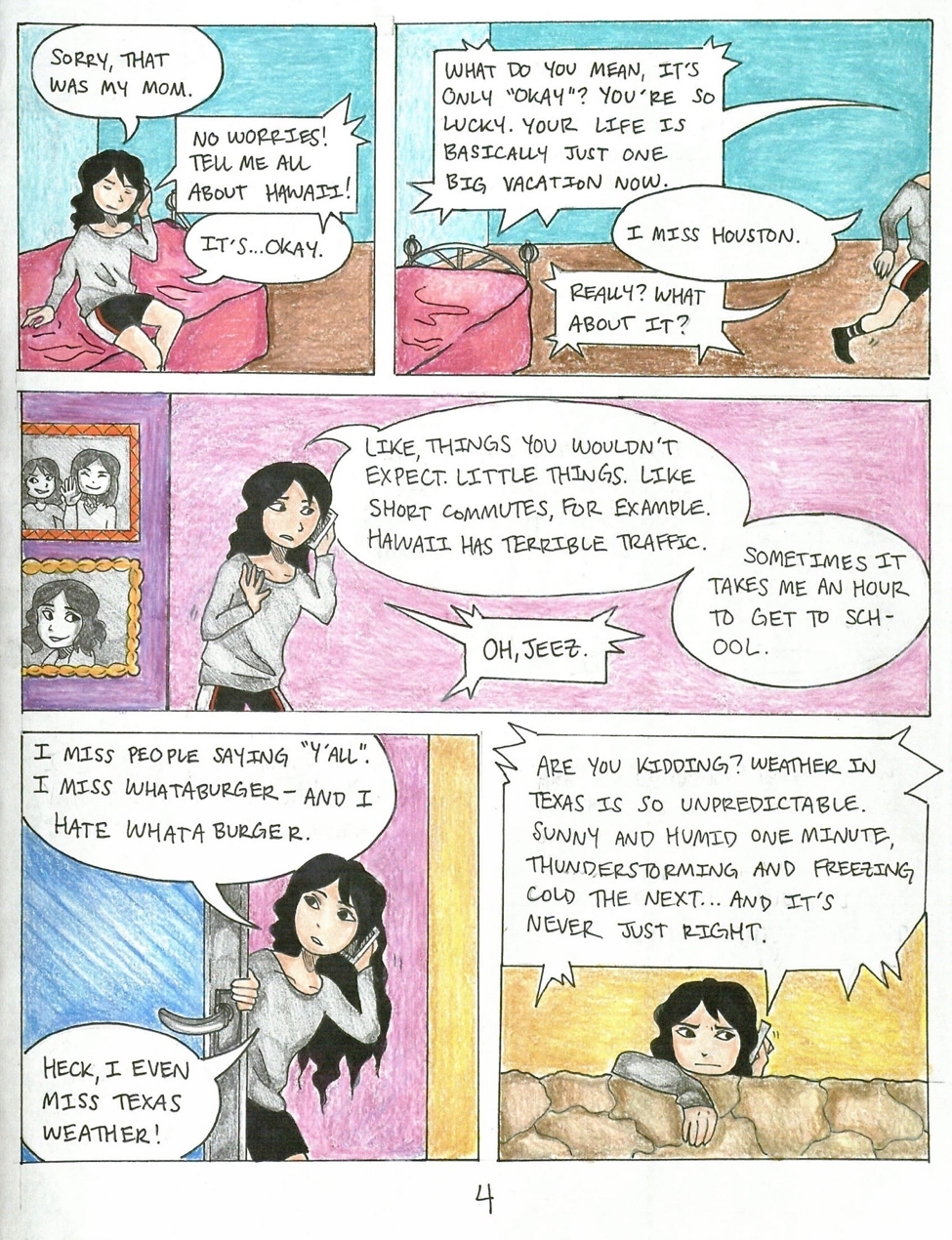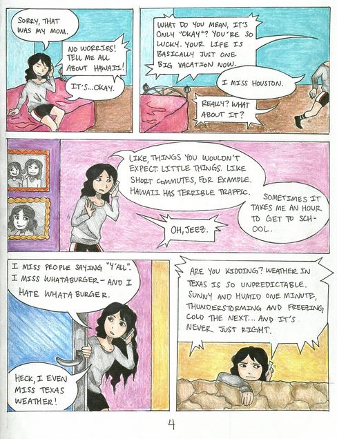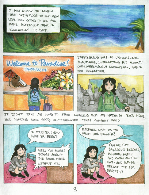 In the final draft of Hello Hometown, I employ both dialogue-based scenes and textual explanations with accompanying illustrations in order to drive the story forward. My most substantial revision consisted of changes to the phone conversation scene in the middle of the graphic memoir. In this scene, Rachael and a friend discuss Rachael’s disillusionment with Hawaii after she moved there, as well as the various aspects of life in Houston that she took for granted before she left. This section was significantly shorter in my first draft—in fact, it only consisted of the two panels at the bottom of page 3 (Fig. 2). I later realized I could foster an increased sense of intimacy between Rachael and the reader by adding additional panels that extended the conversation to include additional related subject matter. This allowed me to more effectively depict Rachael’s homesickness as she felt it in the moment, rather than exclusively portray it through a retrospective lens, as I had during my oral storytelling presentation.