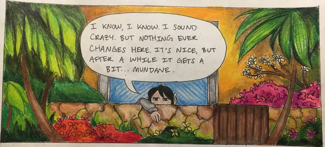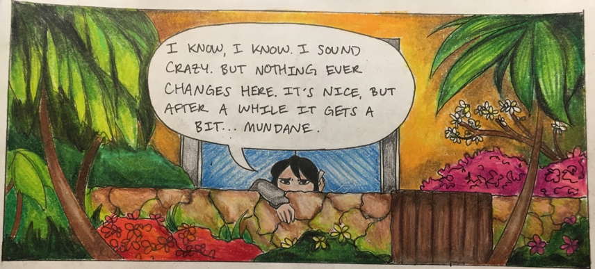 The phone conversation concludes with the large panel at the top of page 5. In this panel, I used both Rachael’s verbal commentary and grayscale coloring to visually juxtapose her unhappiness and the stunning beauty of her surroundings (Fig. 3). “Nothing ever changes here,” she grumbles. “It’s nice, but after a while it gets a bit…mundane” (5).